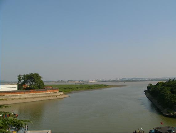 入口处的线条呈优美的弧线,一片尖尖的绿洲,象陆地的触角伸入运河和长江的水中,不时有水鸟从交汇处上方飞过,长江里的货轮、江对面镇江的高楼和江上淡灰色的润扬大桥构成了这幅水彩画的背景。
